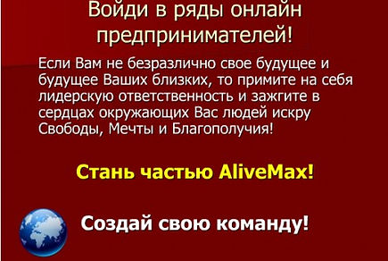 Компания AliveMax – Живи по Максимуму стартовала 1 мая 2009г. одновременно в 80-ти странах с уникальными продуктами для здоровья. Через два года компания пришла в Казахстан, на сегодня продукцией компании пользуются люди в 156 странах мира Компания входит в сотню лидеров МЛМ компаний.